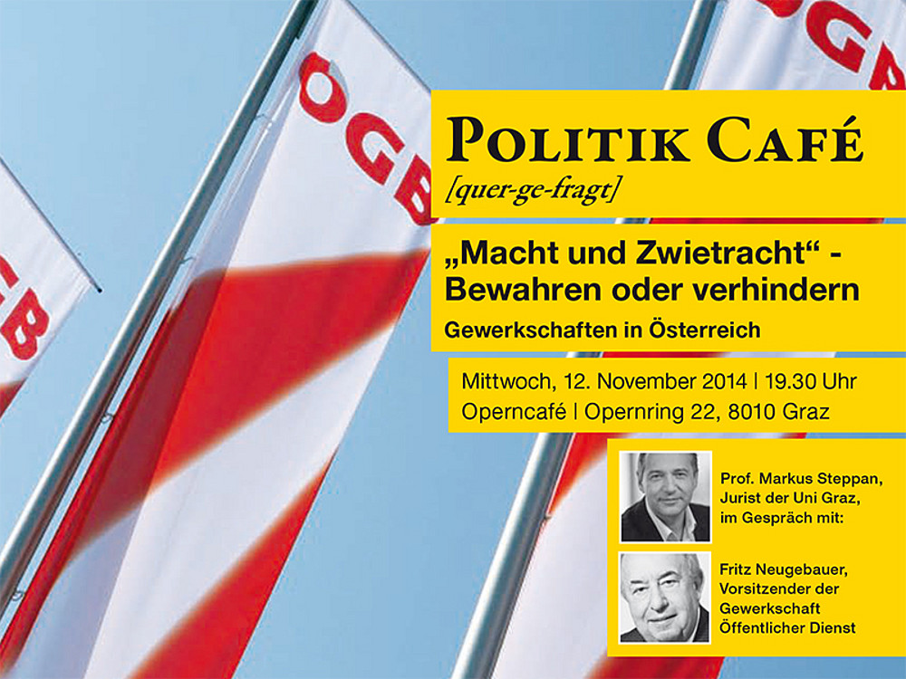 Bewahren oder verhindern die Gewerkschaften Österreichs Wettbewerbsfähigkeit? Eine heiße Debatte ist im Politik Café am 12. November 2014 vorprogrammiert. Rechtswissenschafter Markus Steppan begrüßt im Rahmen der Uni-Graz-Reihe ÖVP-Politiker Fritz Neugebauer, Vorsitzender der Gewerkschaft Öffentlicher Dienst und langjähriger Nationalratsabgeordneter.