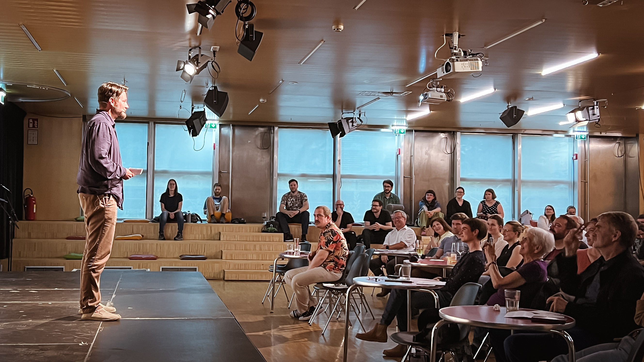 Begriff #1 "(Info)Kanal” wurde von Hildrun Walter (Expertin für Wissenschaftskommunikation & Fake News) und Stefan Schmitzer (Grazer Autor, Lyriker) vorgetragen, und Begriff #2 „A/ausrede(n)“ von Thomas Brudermann (Klimapsychologe) und Mieze Medusa (Slammerin und Autorin).