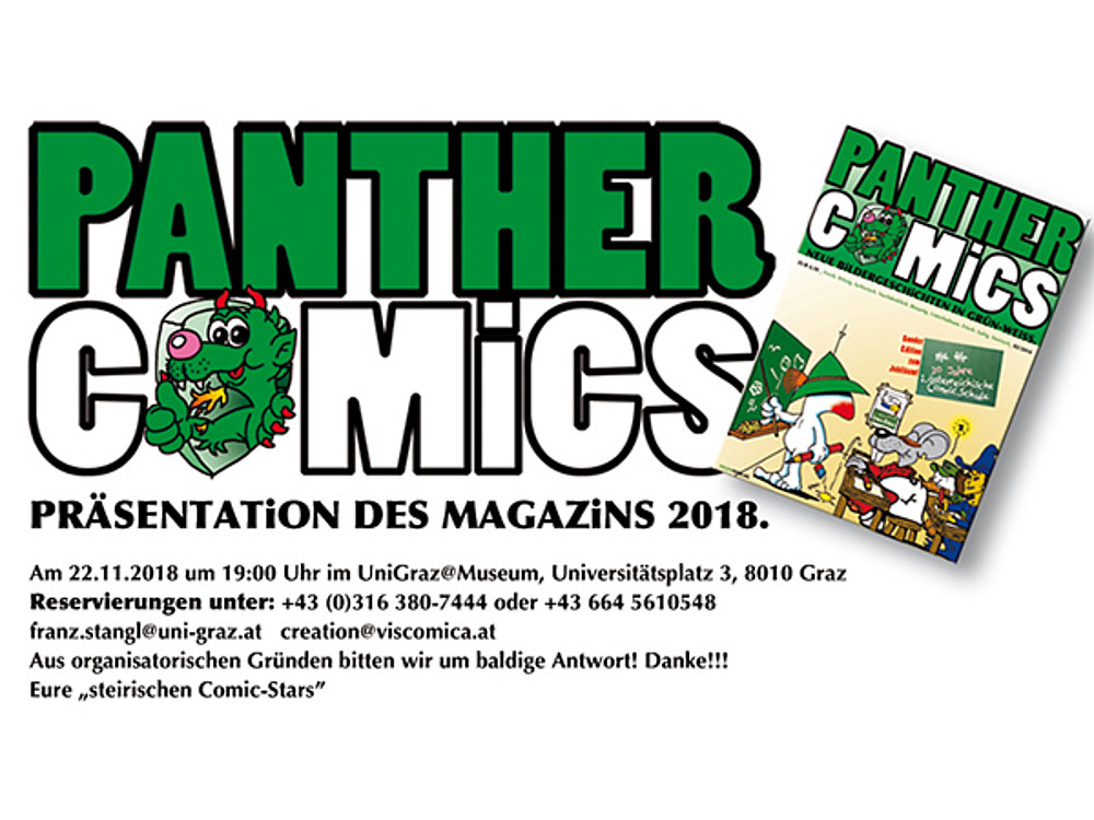 Das UniGraz@Museum und die 1. österreichische Comic.Schule laden ein, zur Präsentation des Panther Comics 2018. Der steirische Comic-Botschafter und Schöpfer der Straßengler Kirchenmaus Gerry Lagler präsentiert in diesem Band seine aktuellsten Werke.